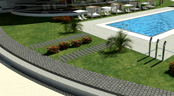 Una piscina exterior requiere de unas necesidades inmediatas de evacuación y drenaje del agua para garantizar la seguridad y la higiene de los usuarios de estas instalaciones en un hotel. Hexaline de ACO es un canal de drenaje que permite conseguir estos objetivos al colocarse en el borde las piscinas de exterior. Fabricado en polipropileno reciclado, es de fácil instalación y mantenimiento.